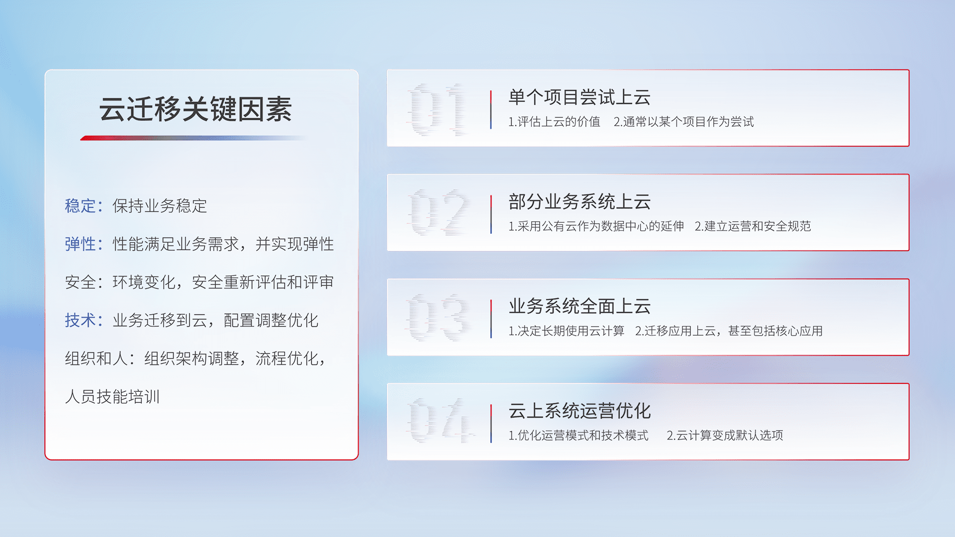 结合实际业务,,,,从规划设计、、云平台选型、、云原生改造、、数据迁移、、、集成交付,,,,迁移全过程为客户识别最佳上云路径,,,,做好风险识别管理,,,,设计网络架构、、身份权限、、、安全审计合规、、、操作审计、、、日志审计、、监控告警策略、、、多站点容灾设计等,,对云上基础设施进行整体规划,,提升IT治理水平,,,,以满足弹性、、高可用、、、高性能的需求。。。